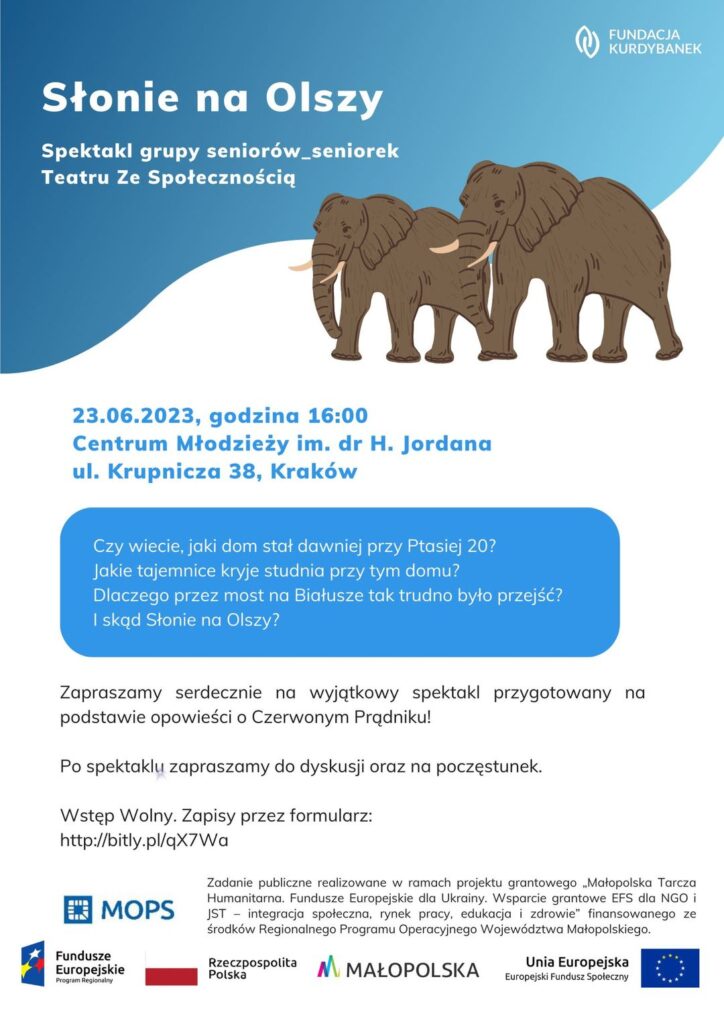 SPEKTAKL TEATRU ZE SPOŁECZNOŚCIĄ PT. „SŁONIE NA OLSZY” https://kurdybanek.buzz/bez-kategorii/spektakl-teatru-ze-spolecznoscia-pt-slonie-na-olszy/ Fri, 30 Jun 2023 10:43:50 +0000 https://kurdybanek.buzz/?p=3758 23 czerwca to nie tylko zakończenie roku szkolnego… W Centrum Młodzieży im. dr. H. Jordana w Krakowie publiczność odbyła niezwykłą podróż na Olszę. Jak? Za sprawą grupy seniorów i seniorek polskiego i ukraińskiego pochodzenia, biorących udział w projekcie ,,Teatr ze Społecznością – od integracji do wspólnoty”.