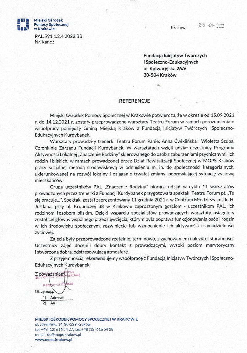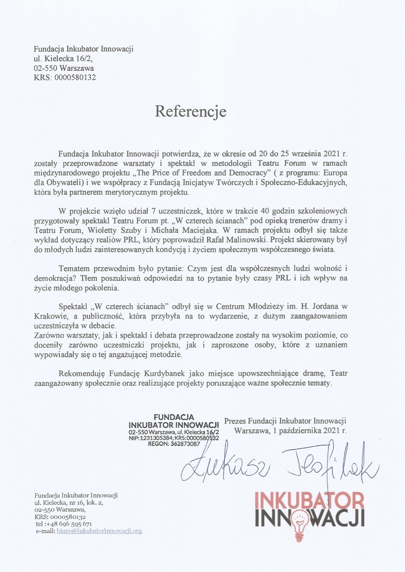 „Drama jest wielowarstwowa, dokładnie tak samo, jak wielowarstwowi jesteśmy my. Doświadczenia dramowe pozwalają nam przyglądać się sobie, warstwa po warstwie, sprawiają, że patrzymy zarówno w głąb siebie, jak i w dal, poza horyzont. Kurs dramy to ucieleśnione doświadczenie tego, jak drobne rzeczy potrafią być zaskakująco pełne wielkiego znaczenia. To okazja do eksplorowania granic tego, gdzie kończy, a gdzie zaczyna się moje ja, a także tego, kiedy przestaję, a kiedy być może zaczynam być sobą. Fundacja Kurdybanek to miejsce, które pozwala zasmakować dramy w bezpieczny i wspierający sposób, warto skosztować.”