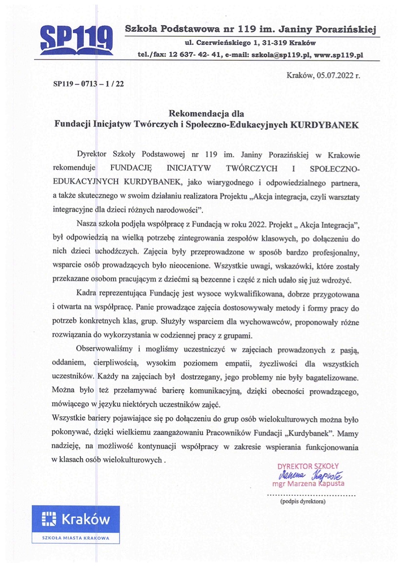 „Drama jest wielowarstwowa, dokładnie tak samo, jak wielowarstwowi jesteśmy my. Doświadczenia dramowe pozwalają nam przyglądać się sobie, warstwa po warstwie, sprawiają, że patrzymy zarówno w głąb siebie, jak i w dal, poza horyzont. Kurs dramy to ucieleśnione doświadczenie tego, jak drobne rzeczy potrafią być zaskakująco pełne wielkiego znaczenia. To okazja do eksplorowania granic tego, gdzie kończy, a gdzie zaczyna się moje ja, a także tego, kiedy przestaję, a kiedy być może zaczynam być sobą. Fundacja Kurdybanek to miejsce, które pozwala zasmakować dramy w bezpieczny i wspierający sposób, warto skosztować.”